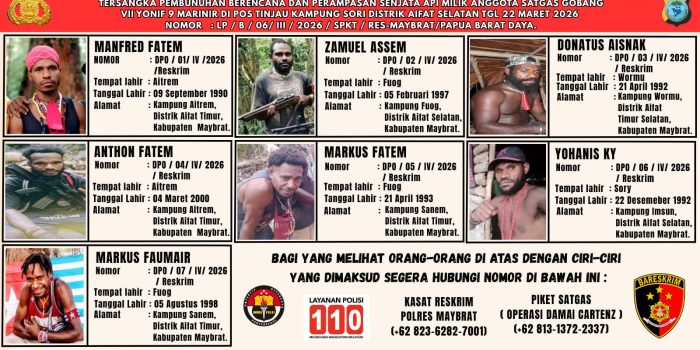 SORONG – Hingga kini pelaku perampasan senjata dan pembunuhan berencana yang menewaskan 2 anggota Satgas Gobang VII Yonif 9 Marinir Prada Mar