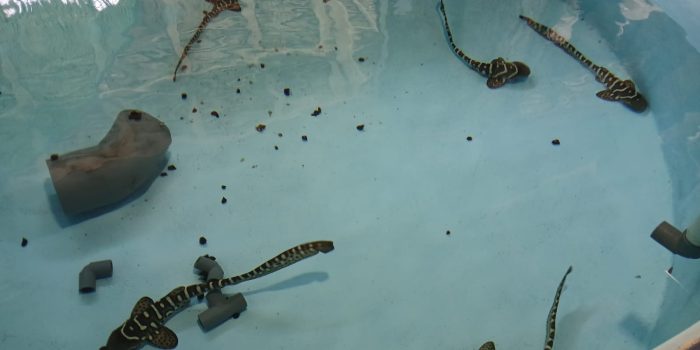 “Ke Jakarta transit dulu sehari, sambil kita mengurus surat-surat domestiknya ke Sorong. Sampai Sorong naik kapal ke sini (Pulai Kri), itu biasa menetasnya beda-beda, tergantung  berapa besarnya embrionya di dalam. Biasa butuh 110 sampai 150 hari sebelum dia menetas,”tutur pengeloa Ikan Hiu Belimbing.