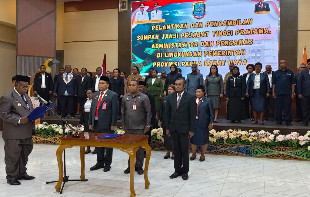 SORONG– Gubernur Papua Barat Daya Elisa Kambu melantik 6 Pejabat Tinggi Pratama, 22 Administrator dan 22 Pengawas di lingkungan Pemerintah Provinsi Papua Barat Daya, Senin (13/10/2025).
