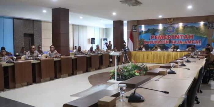 Rapat tersebut berlangsung di Aula Pemkab Raja Ampat. Kapolres Raja Ampat, AKBP Jems Oktovianus Tegai, S.I.K., bersama jajaran Pejabat Utama (PJU) Polres Raja Ampat juga mengikuti rapat koordinasi melalui Vicon yang dimulai pukul 10.00 WIT.