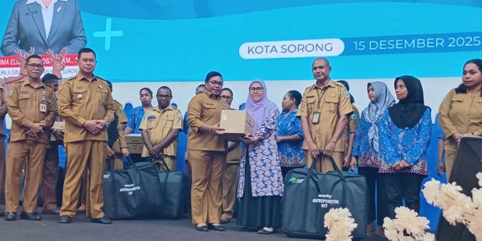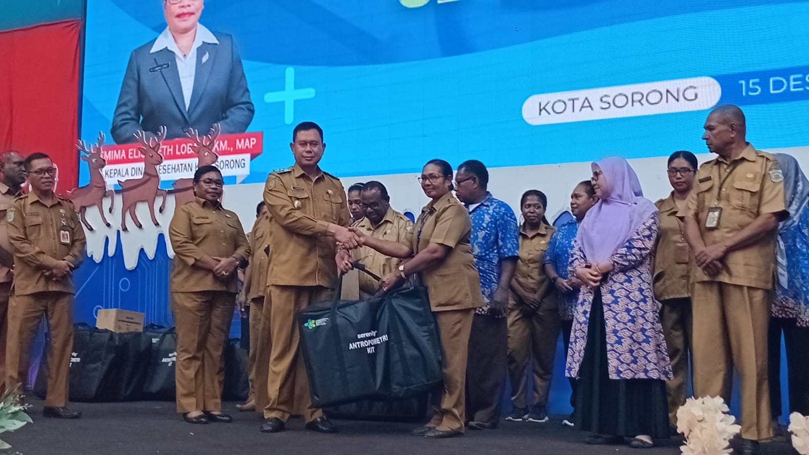 SORONG– Pemerintah Kota Sorong melalui Dinas Kesehatan (Dinkes) menyerahkan Posyandu Prima Antropometri KIT dan uang transportasi kepada kader posyandu se-Kota Sorong, Senin (15/12/2025) di Gedung Lambert Jitmau.