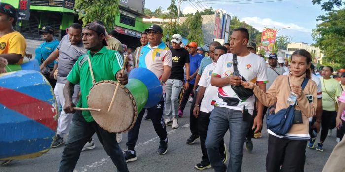 Diikuti segenap pimpinan OPD dan ASN Pemprov Papua Barat Daya, TNI Polri dan instansi lainnya, jalan sehat yang diramaikan dengan kelompok seruling tambur dikawal Sat Lantas Polresta Sorong Kota.