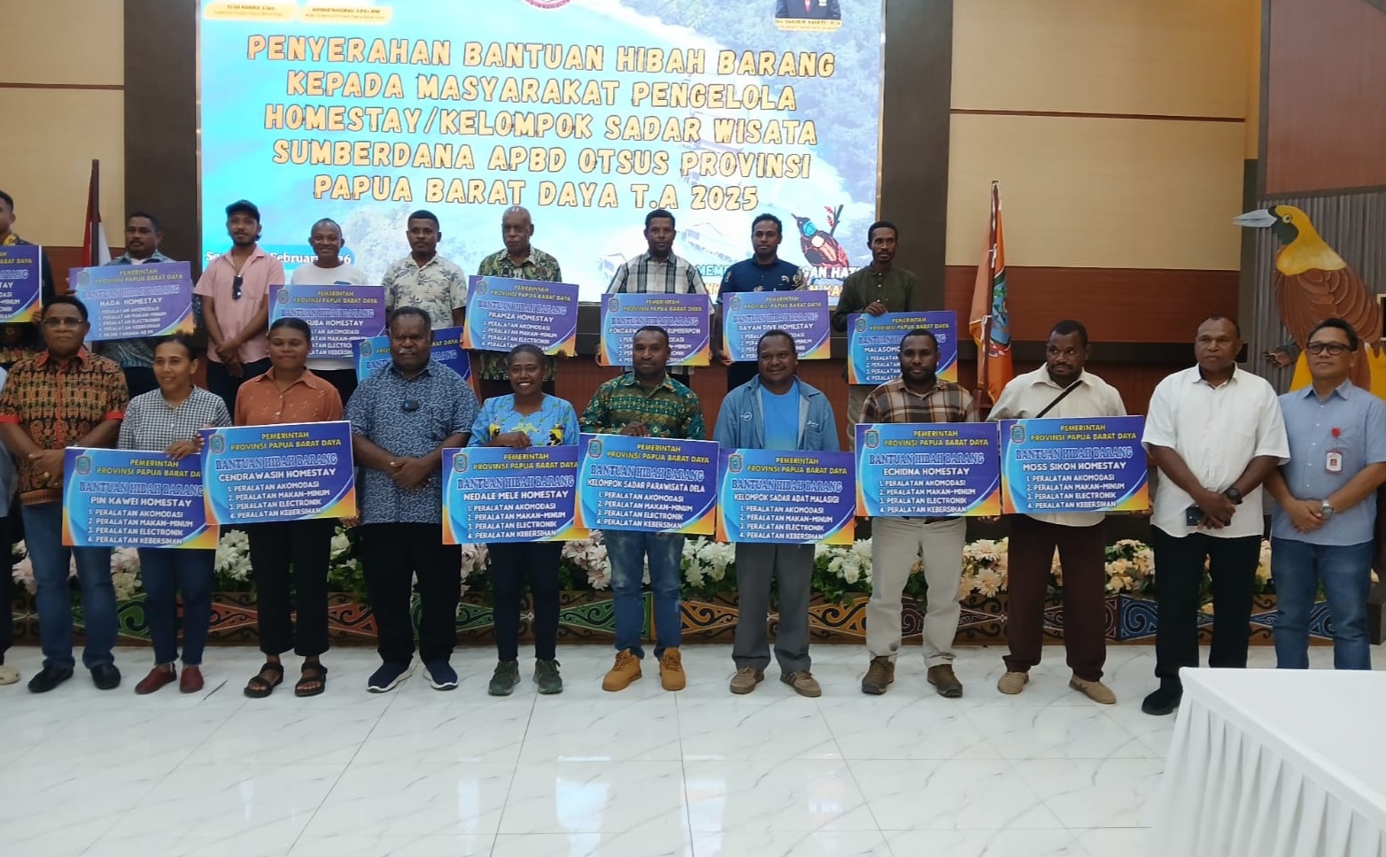 SORONG– Gubernur Papua Barat Daya, Elisa Kambu menyerahkan bantuan hibah barang kepada 17 masyarakat pengelola homestay/kelompok sadar wisata, Sabtu 21 Februari 2026 di Ruang Pertemuan Lantai 3 Kantor Gubernur Papua Barat Daya.