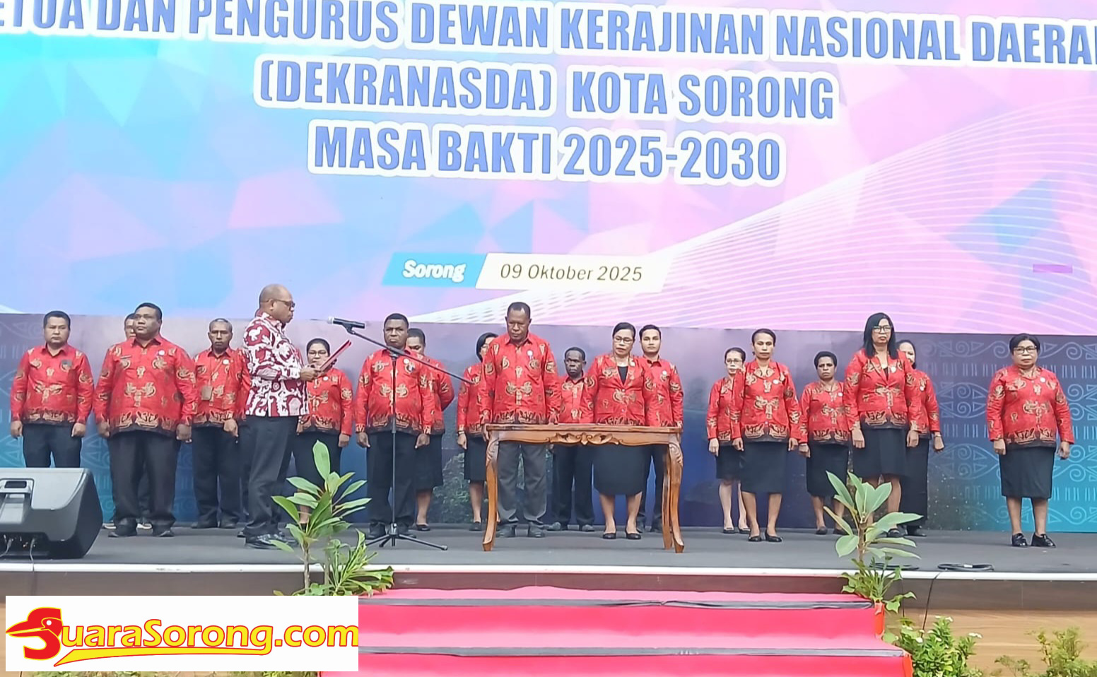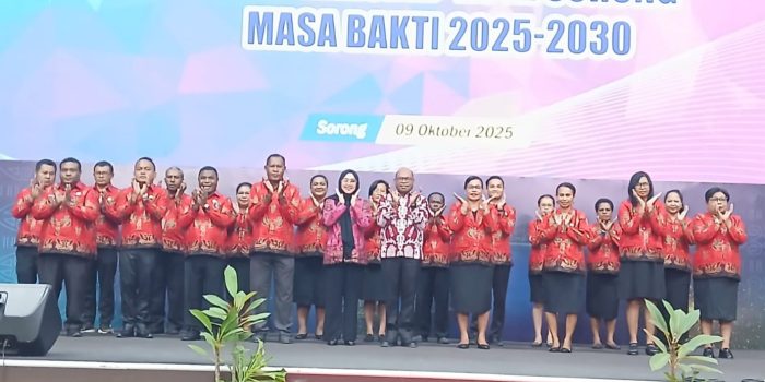 SORONG– Bertempat di Gedung Lambert Jitmau, Wali Kota Sorong, Septinus Lobat, SH, M.PA, Kamis (9/10/2025)  melantik Ketua dan Pengurus Dewan Kerajinan Nasional Daerah (Dekranasda) Kota Sorong periode 2025-2030.