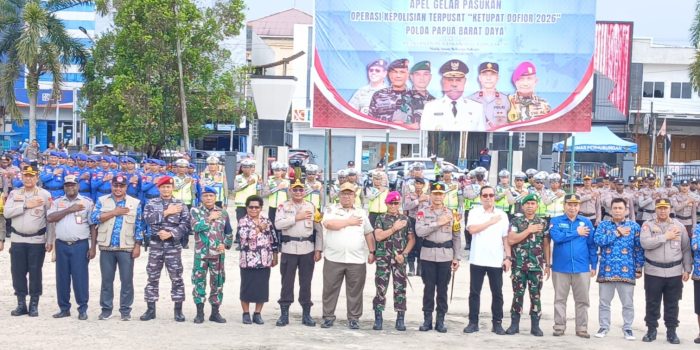 SORONG– Kapolda Papua Barat Daya, Brigjen Pol Gatot Haribowo, S.IK, M.AP memimpin apel.gelar pasukan Operaai Kepolisian Terpusat “Ketupat Dofior 2026” di Alun-Alun Aimas, Kamis (12//3/2026).
